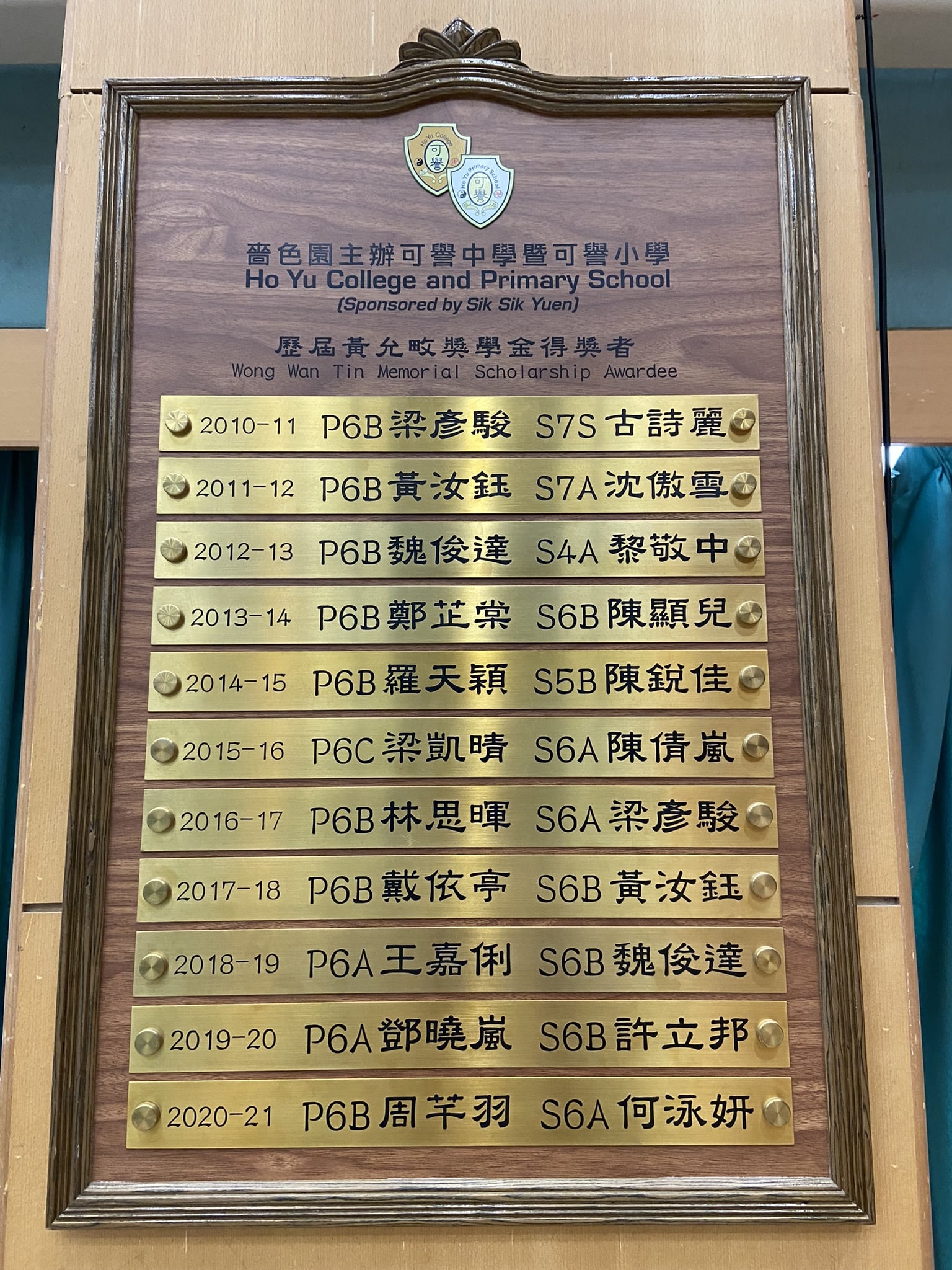 獎學金 「黃允畋紀念獎學金 — 傑出學生獎(中學)」 「黃允畋紀念獎學金 — 傑出學生獎(中學)」旨在獎勵每學年於學業、德行及課外活動整體表現傑出的學生,得獎者會獲得獎學金,名字亦會刻在禮堂的金屬板上,成為其他學生的榜樣。