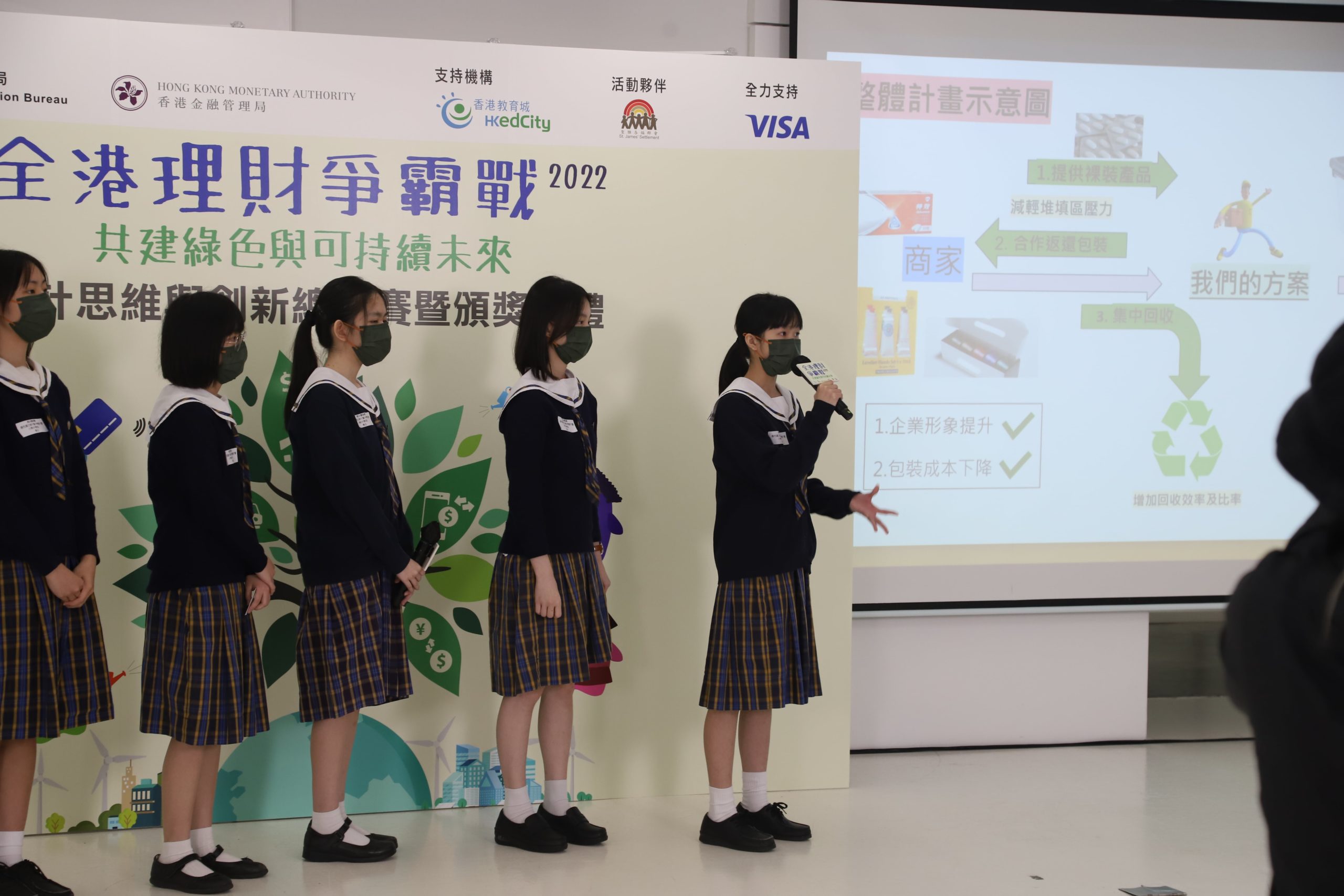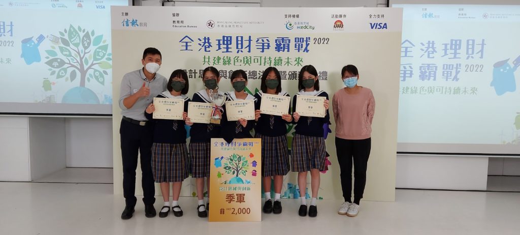 「全港理財爭霸戰2022 (設計思維與創新)」 12/07/2023 本校中五丙班霍佩雯、郭穎、黃可晴、余虹燕及袁天恩同學早前參加「全港理財爭霸戰2022 (設計思維與創新)」,在限時內向評審團滙報理財創意構思。最終同學憑著正確的理財知識,同時顧及綠色與可持續發展,勇奪比賽季軍。